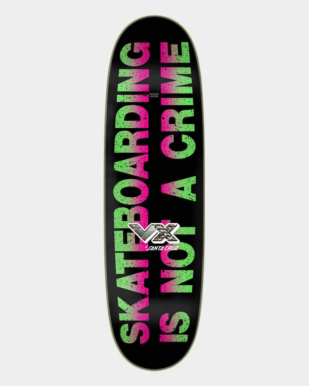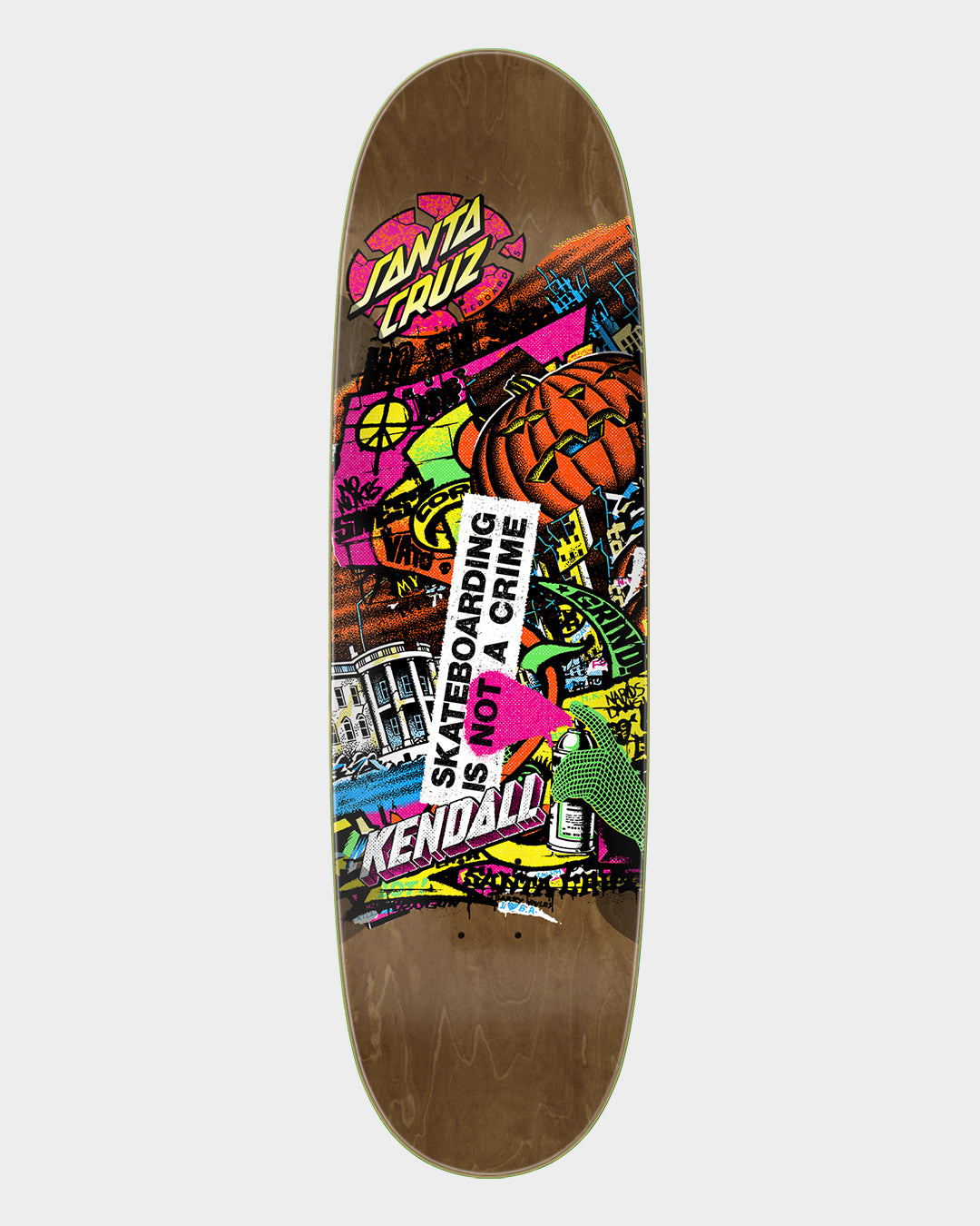 Santa Cruz Skateboards Jeff Kendall Street Art Collage VX Deck featuring spot matte and neon graphics on brown stained veneer with custom 9" egg shape with 4 wheel wells. VX decks are thinner, stronger, and have more pop than standard 7 ply decks featuring 5 plies of North American Maple and 2 layers of Quad X technology. 3D is a mellow concave with lower, symmetrical nose and tail kicks. Continuous kick and slight concave pockets in the nose and tail give you ultimate control and comfort for your tricks.