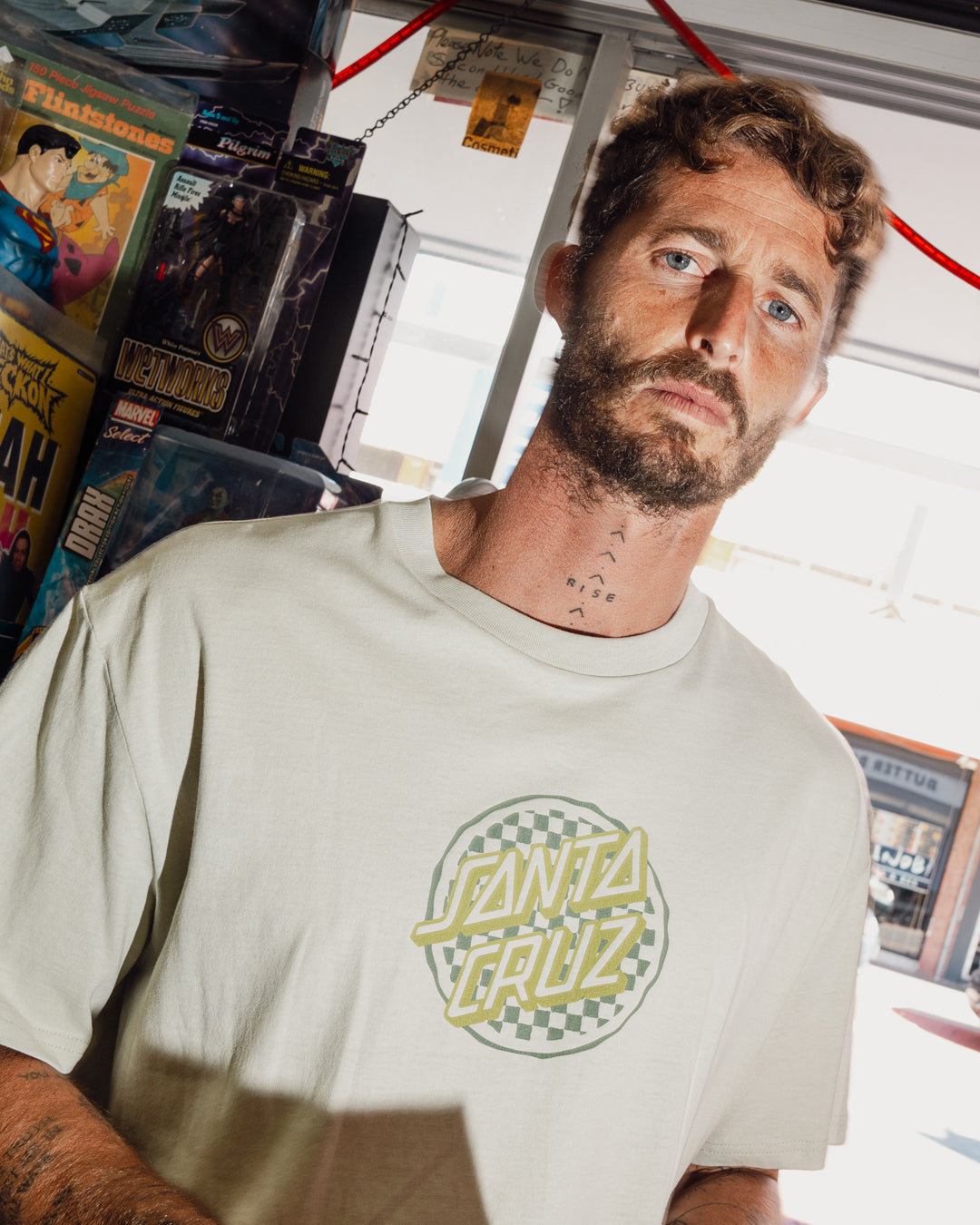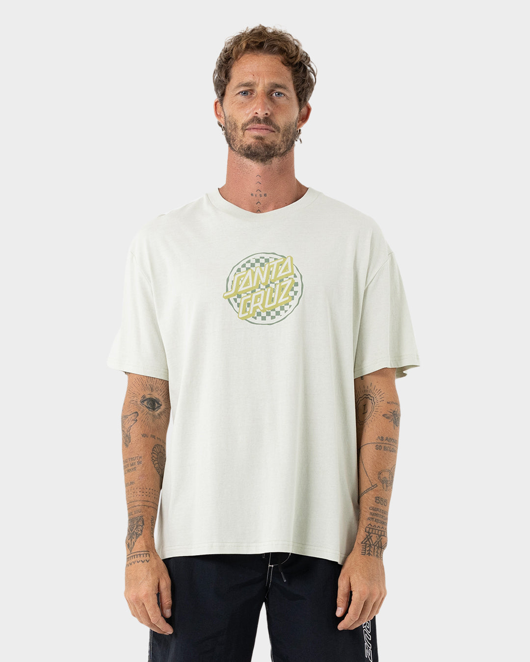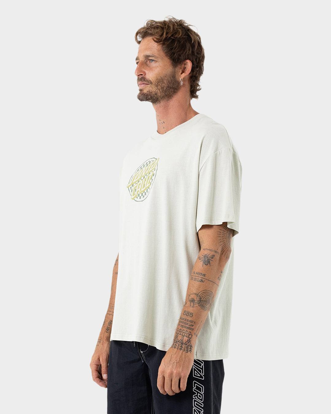Men's Santa Cruz box fit t-shirt featuring cracked ink screen print of the Breaker Check Opus Dot artwork.