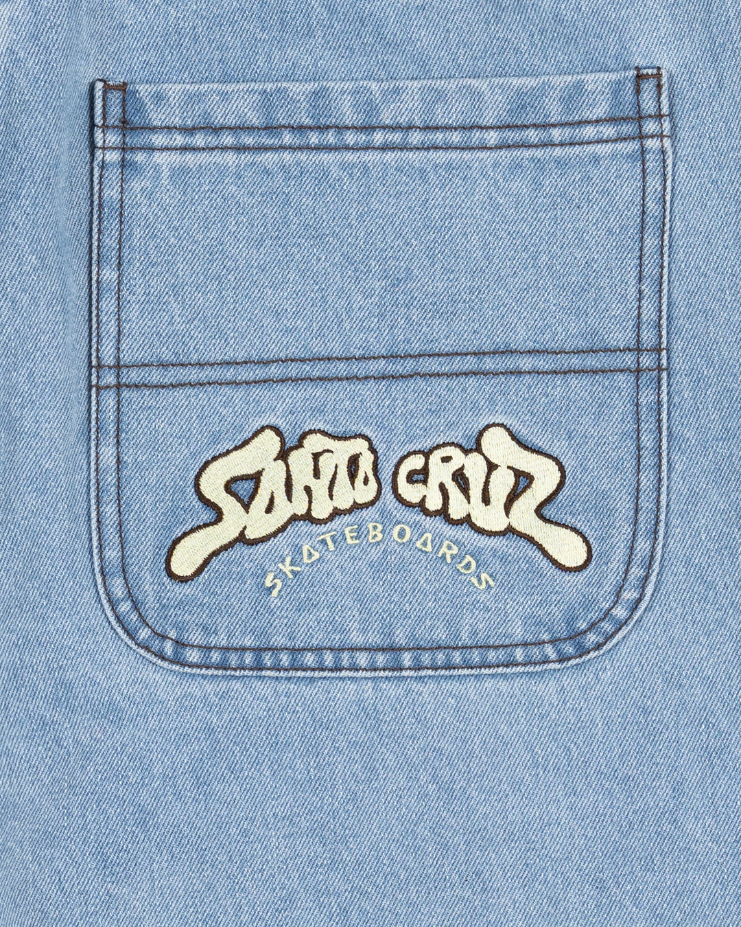 Men's Santa Cruz jean shorts featuring woven label of the Winkowski 8Baller Arch artwork.